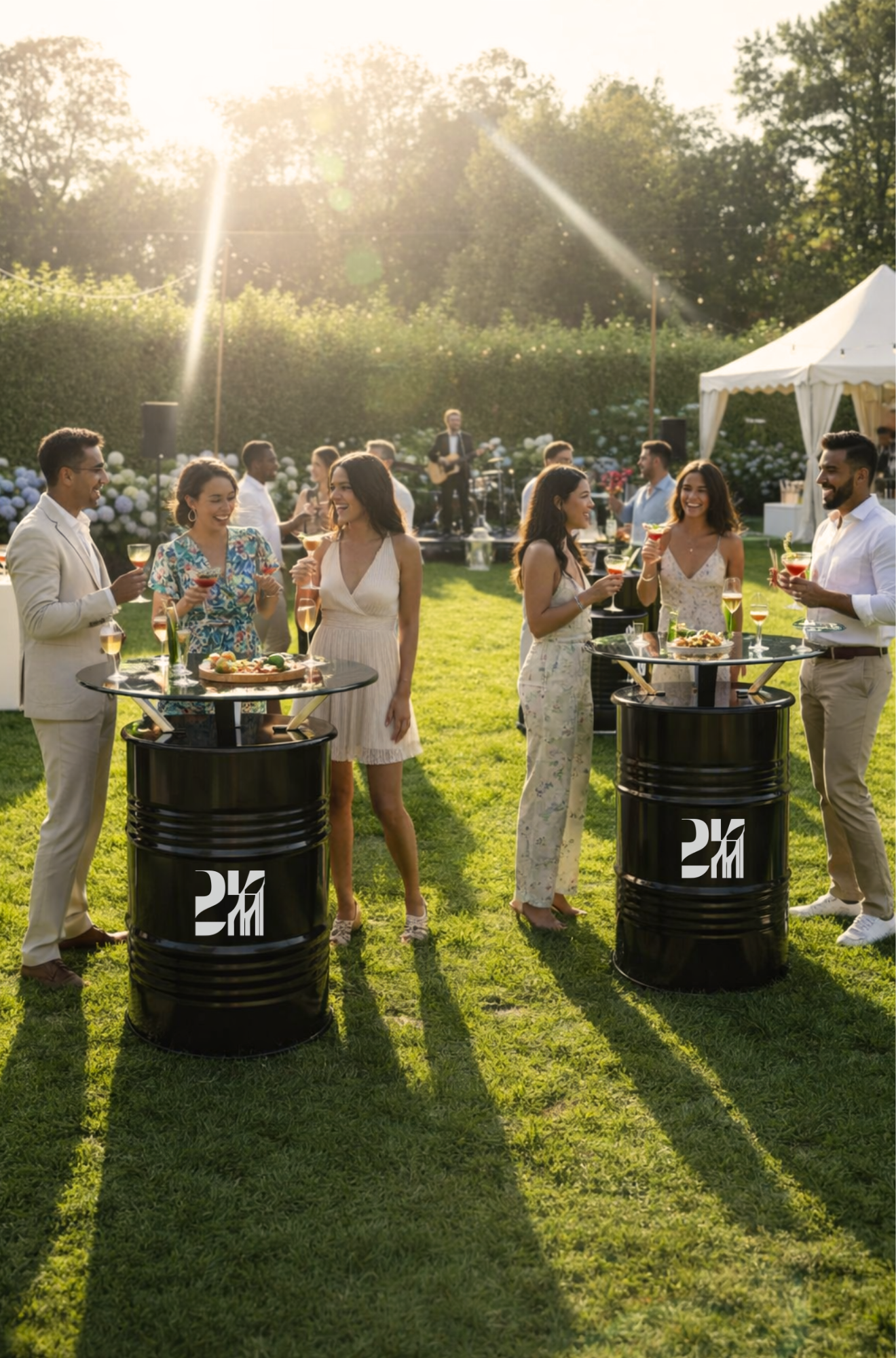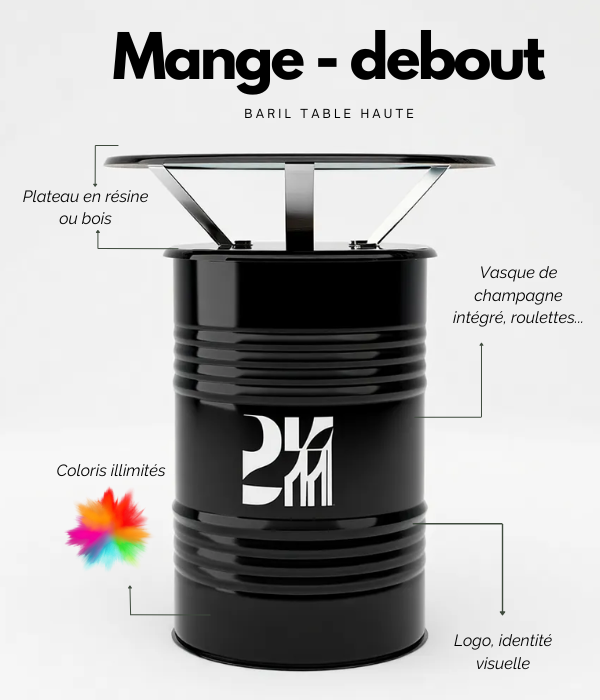 Pensés pour sublimer vos événements, nos barils allient design, fonctionnalité et personnalisation. Bien plus que de simples supports, ils deviennent de véritables éléments de décoration et de communication, capables de s’adapter à tous les univers : mariage, événement d’entreprise, réception privée, salon professionnel ou soirée promotionnelle. Grâce à une conception soignée et des options modulables, chaque baril est conçu pour répondre précisément à vos besoins.